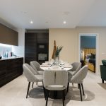 Open plan, L-shaped kitchen with quartz worktops and integrated energy-efficient appliances including touch control ceramic induction hob, dual fan oven, microwave, separate stacked fridge and freezer, dishwasher plus washer/dryer. Room to entertain with marble effect dining table and six chairs.