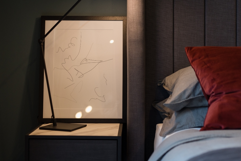 Double bedroom with ottoman storage & feature headboard.
